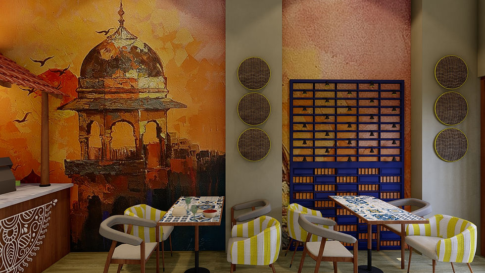The design of this South Indian café merges contemporary sensibilities with cultural depth, creating a vibrant yet intimate space for casual dining and family gatherings. Drawing from the rich textures and colors of South Indian heritage, the interior incorporates bold hues and geometric patterns, infusing the environment with energy and warmth. Traditional elements are seamlessly integrated with modern design, creating a balanced dialogue between past and present. The café is conceived as a dynamic yet welcoming space, offering guests an immersive experience that celebrates authentic South Indian cuisine in a setting that is both lively and comfortable.